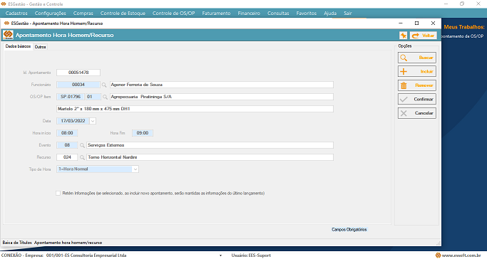 Lance o apontamento de mão de obra e recursos, tendo, ao encerramento da OS/OP, a apuração de custos do produto final.